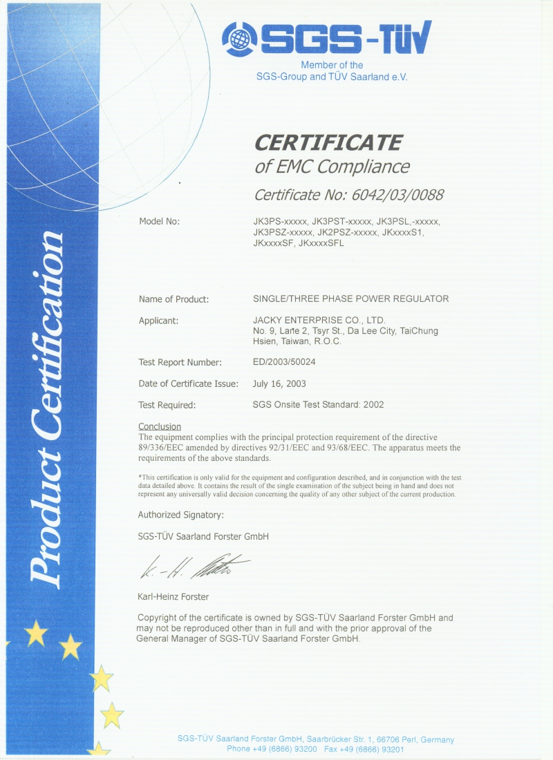 JAKI积奇产品在台湾唯一全系列获得CE国际质量认证的公司,且深受台湾上市、上柜公司和各研究院的支持与爱护,另也深受国内客户的爱用.产品全部通过CE、IEC60947-4-2认证合格规范。